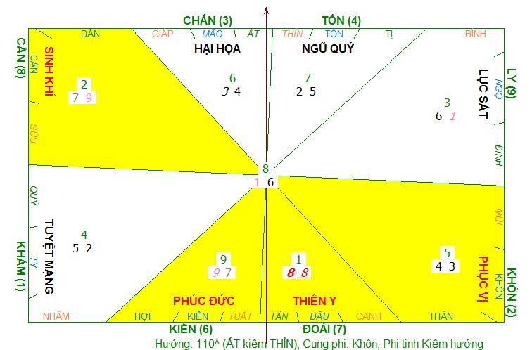 Phương án 1: Tiết kiệm chi phí giữ nguyên hướng cũ là 110 độ, nhà này lợp mái tôn lên vừa chống nóng và chống dột và bể cảnh có thủy phải đặt vào cung cấn (tức là hướng đông bắc tính từ tâm nhà), vì cung này có hướng tinh sao cửu tử đang là sao sinh khí. Còn cửa đi vào nhà có thể mở cân đối cho đẹp về kiến trúc, nhưng đi ra vào và mở thường xuyên thì chỉ mở cửa bên tay trái (tính từ trong nhà nhìn ra) ở cung chấn (đông) và cung cấn (đông bắc). Có đồ hình phong thủy như sau: