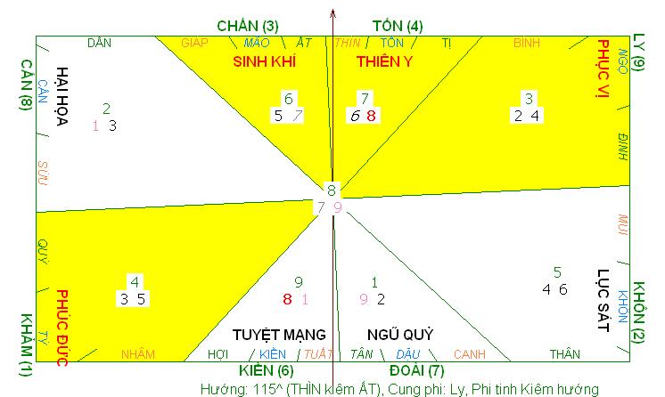 Phương án 2: Tuy tốn kém thêm tiền vào sửa nhà nhưng cổng lại không phải sửa, nhưng về phong thủy lại phát rất lớn hơn phương án 1 và không mất khoảng sân bị lấn vào. Ở phương án này khi lợp mái sẽ phải nắn thêm 5 độ để nhà có số độ là 115 độ thì đồ hình phong thủy như sau: