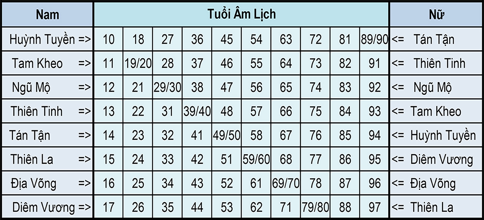 - Thiên La: Gặp hạn Toán tận, đề phòng cảnh phu thê ly cách, nhẫn nhịn trong nhà để tránh cảnh đó, chớ ghen tương gắt gỏng mà chuyện bé xé ra to.