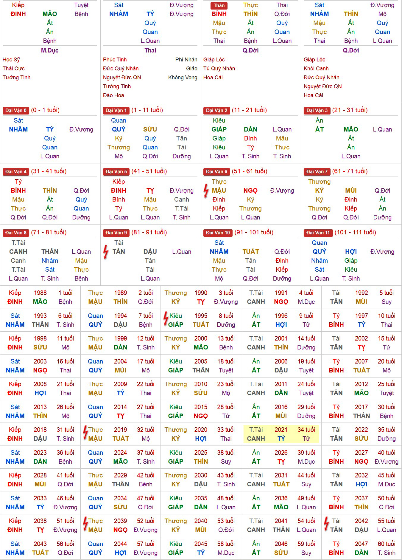 - Đại Vận 3 (21 - 31 tuổi): Gặp vận phát triển tính cánh mạnh mẽ, học hành công việc hanh thông, dám làm dám chịu