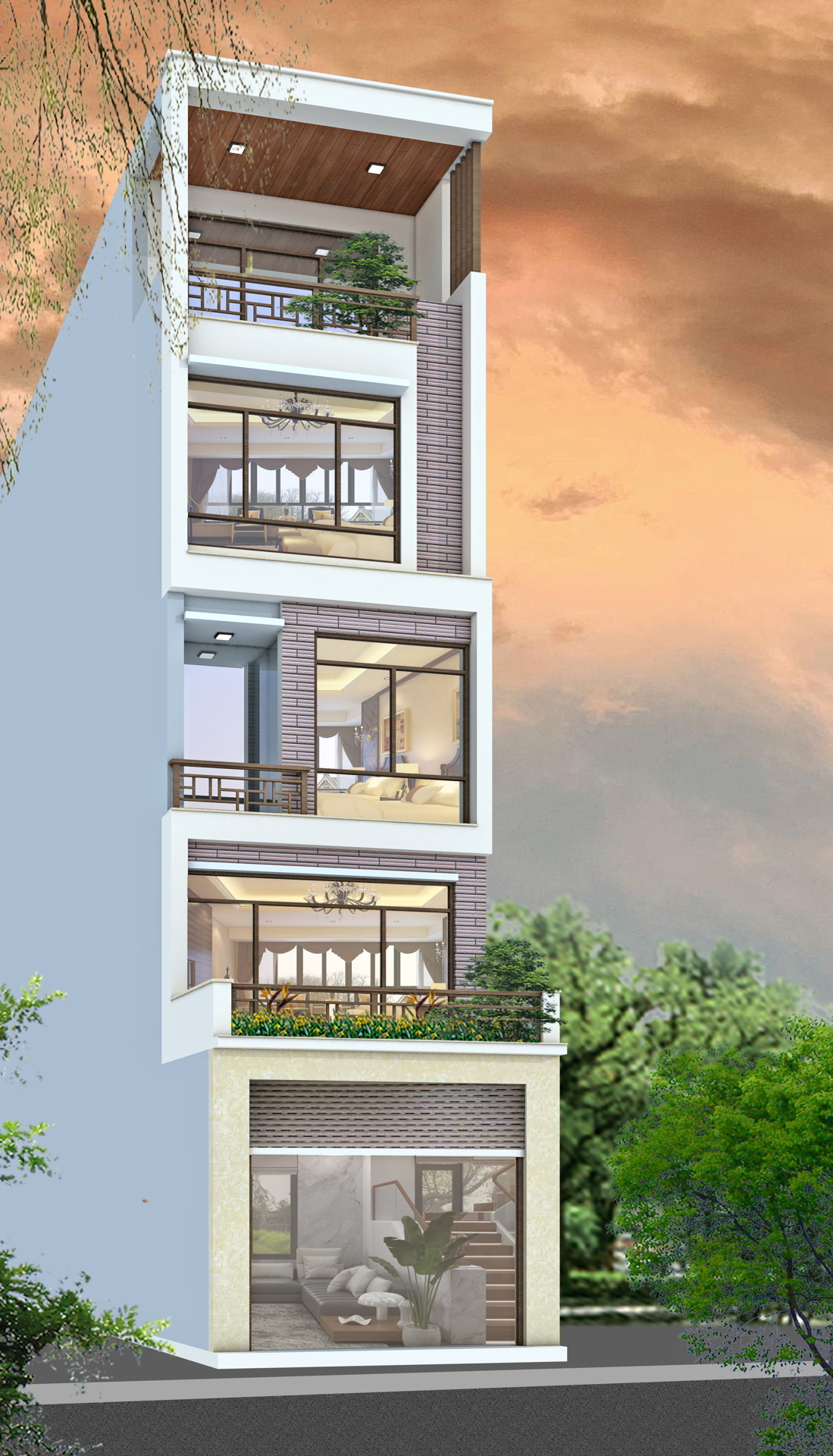 Nhà mặt phố 5 tầng hiện đại thiết kế phong thủy và kiến trúc Nhà mặt phố 5 tầng hiện đại thiết kế kiến trúc theo phong thủy - Tầng 1 có gara và phòng khách - Tầng 2 có phòng ngủ master + phòng thay đồ - Tầng 3-4 có 2 ngủ + wc chung - Tầng 5 có bếp + phòng sinh hoạt chung - Tum là sân phởi